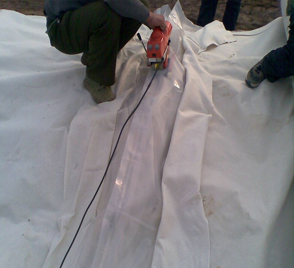 兩布一膜是以塑料薄膜作為防滲基材,與無紡布復合而成的土工防滲材料。它的防滲性能主要取決于塑料薄膜的防滲性能。目前防滲應用的塑料薄膜,主要有聚氯乙烯(PVC)和聚乙烯(PE),它們是一種高分子化學柔性材料,比重較小,延伸性較強,適應變形能力高,耐腐蝕,耐低溫,抗凍性能好。膜的厚度一般為0.30-2.00mm。主要機理是以塑料薄膜的不透水性隔斷土壩漏水通道,以其較大的抗拉強度和延伸率承受水壓和適應壩體變形。而無紡布亦是一種高分子纖維化學材料,通過針刺或熱粘成形,具有較高的抗拉強度和延伸性。目前應用于復合的無紡布只要有:滌綸短纖針刺土工布、聚酯長絲紡粘土工布、扁絲塑編布等。它與塑料薄膜結合后,不僅增大了塑料薄膜的抗拉強度和抗穿刺能力,而且由于無紡布表面粗糙,增大了接觸面的摩擦系數,有利于復合土工膜及保護層的穩(wěn)定。同時,它們對細菌和化學作用有較好的耐侵蝕性,不怕酸、堿、鹽類的侵蝕。
