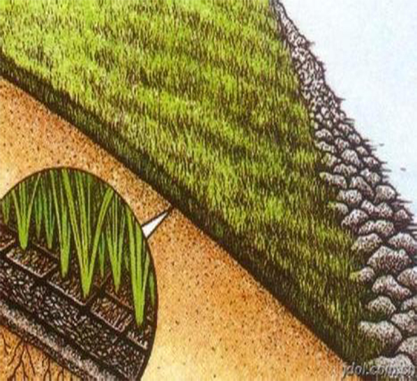 三維植被網(wǎng)是以熱塑性樹脂為原料,采用科學(xué)配方,經(jīng)擠出、拉伸等工序精制而成。它無腐蝕性,化學(xué)性穩(wěn)定,對(duì)大氣、土壤、微生物呈惰性。該產(chǎn)品底層為一個(gè)高模量基礎(chǔ)層,采用雙向拉伸技術(shù),其強(qiáng)度高,足以防止植被網(wǎng)變形,并能有效防止水土流失。表層為一個(gè)起泡層,膨松的網(wǎng)包以便填入土壤、種上草籽幫助固土,這種三維結(jié)構(gòu)能更好地與土壤相結(jié)合。在邊坡防護(hù)中使用三維植被能有效地保護(hù)坡面不受風(fēng)、雨、洪水的侵蝕。該產(chǎn)品功能是有利于植被生長。隨著植被的形成,它的主要功能是幫助草根系統(tǒng)增強(qiáng)其抵抗自然水土流失能力。